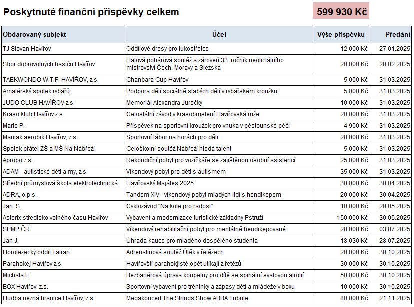 Rozvoj dětí a mládeže, podpora volnočasových aktivit a budování smyslu pro týmovou spolupráci – to jsou hodnoty, které dlouhodobě podporujeme. I proto jsme s radostí finančně podpořili již 35. ročník Halové pohárové soutěže mladých hasičů, který se uskutečnil v havířovské hale Slavia. Nadační fond Teplo na dlani přispěl na tuto mimořádnou akci částkou 20 000 Kč, díky které bylo možné zajistit odměny a ceny pro soutěžící děti.